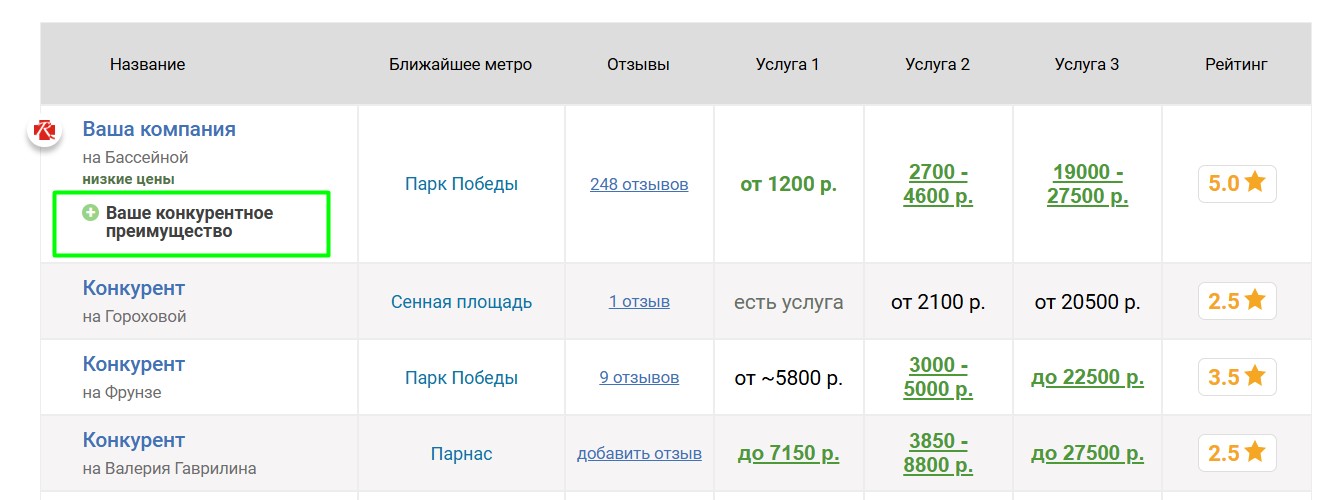 Если компания имеет конкурентные преимущества, мы можем их опубликовать на странице детского сада и показывать в таблицах в соответствующих страницах. Преимущества можно гибко настраивать для разных услуг. Правильная публикация преимуществ существенно увеличивает интерес клиентов, так как выделяет детский сад в таблицах и показывает, почему следует обратиться именно туда.